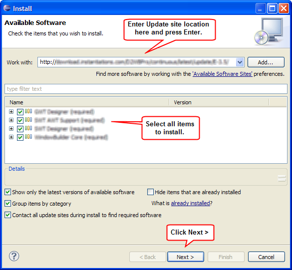 To learn more about how to install software from an update site, please read Adding a new software site from Eclipse Online-Help and follow the instructions there.